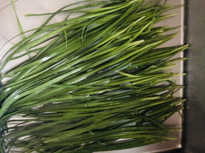 Lá hẹ rửa sạch, cắt khúc dài khoảng 4-5cm, để ráo nước. Lưu ý: Nên chọn lá hẹ non, thân nhỏ để khi xào không bị dai.