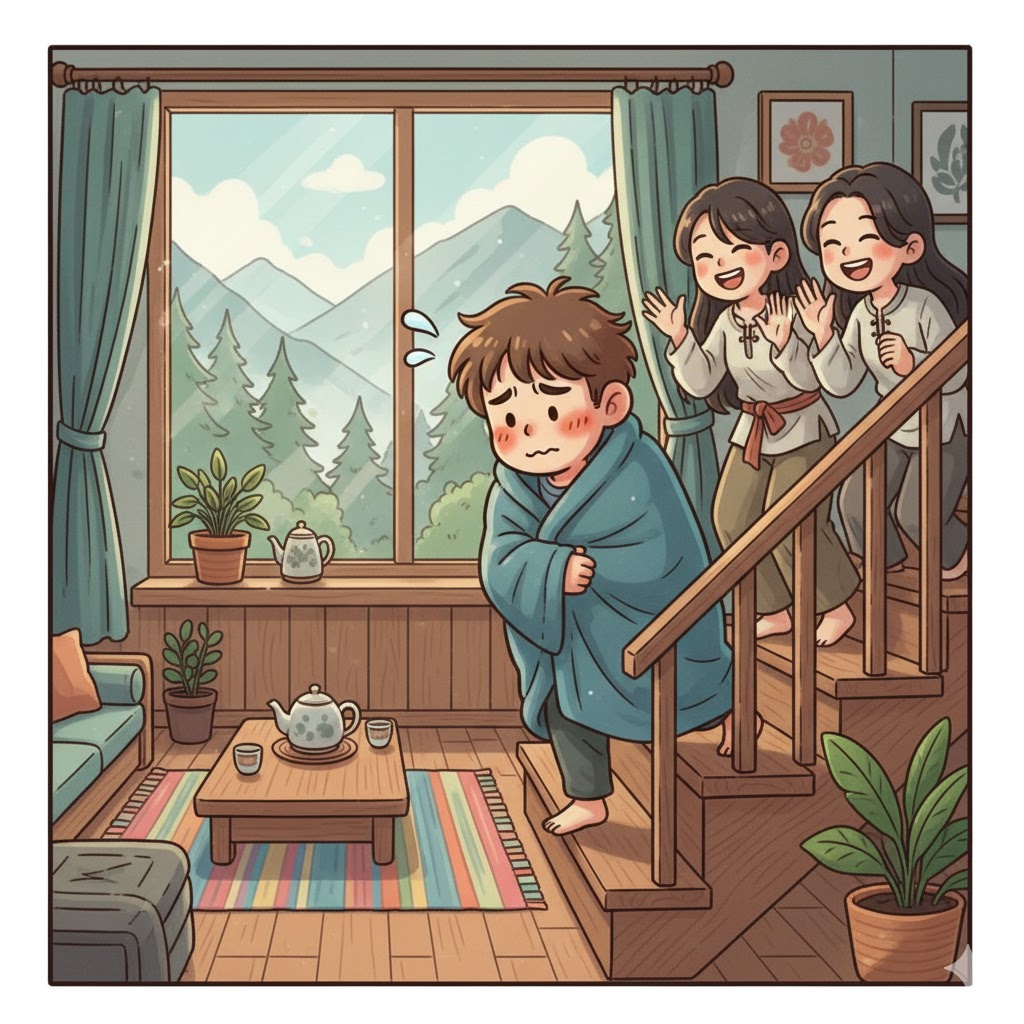 Sáng hôm sau, anh chàng ôm chăn lên chào cảm ơn chủ nhà. Khi đi ngang cầu thang, anh thấy hai cô gái xinh như hoa hậu đang cười nói liền hỏi: