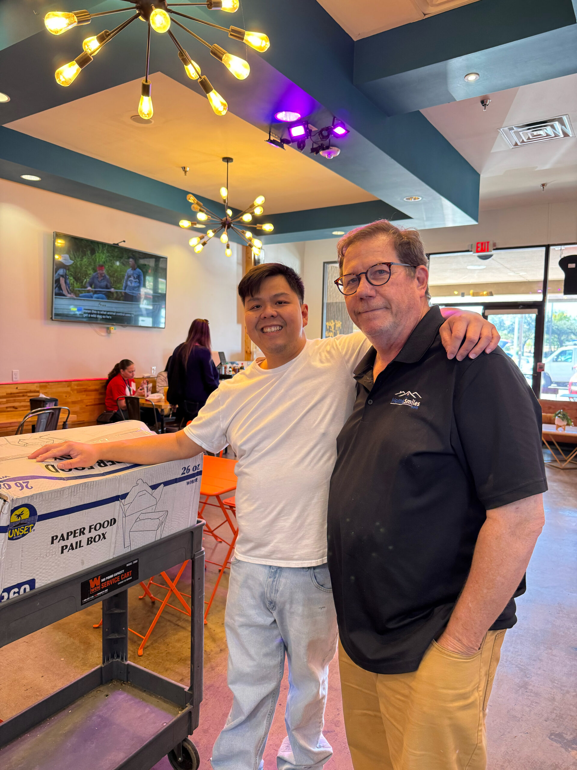 Anh Nhân Ngô (trái) chủ nhà hàng Petit Beignets & Tapioca bên cạnh một người quyên góp (Ảnh: Nhân Ngô cung cấp)