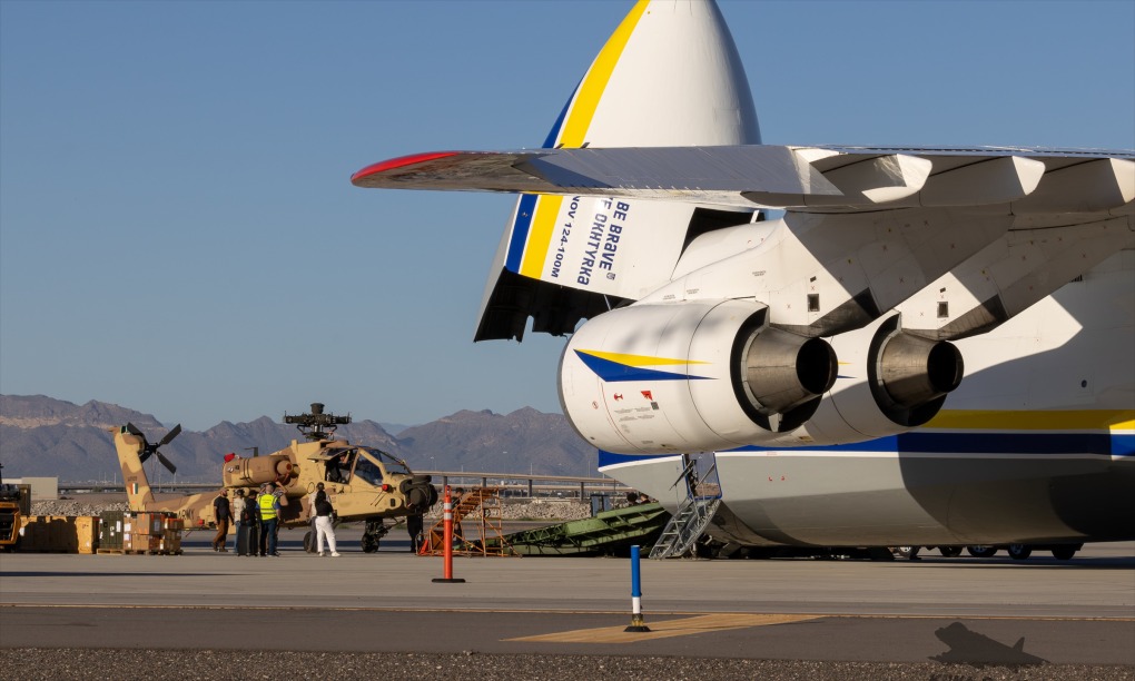 Trực thăng Apache chuẩn bị được đưa lên vận tải cơ An-124 tại sân bay Mesa Gateway hôm 30/10. Ảnh: X/KiwaSpotter