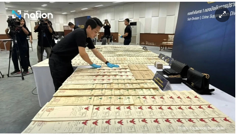 Loạt giấy chứng nhận quyền sở hữu đất bị giới chức tịch thu từ chùa Wat Phra Bat Nam Phu ở tỉnh Lopburi, Thái Lan. Ảnh: National Thailand.