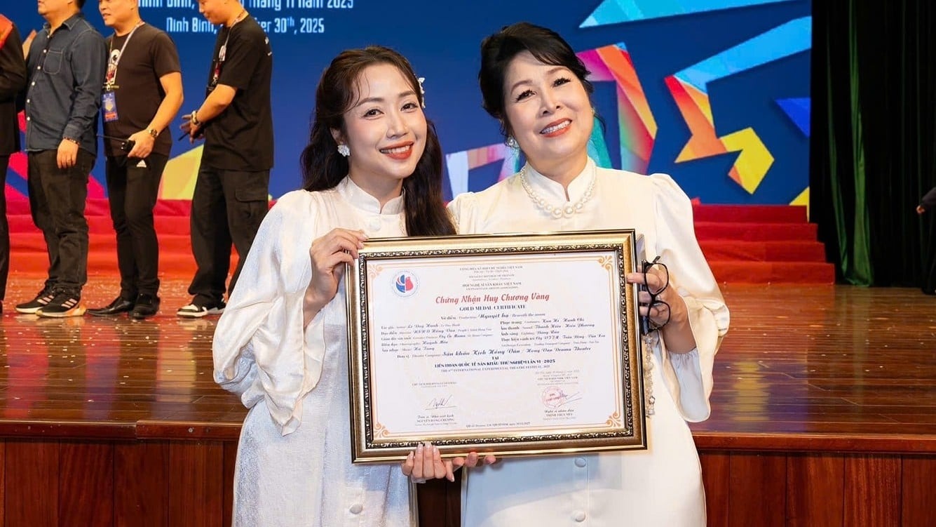 Nghệ sĩ Nhân dân Hồng Vân và Ốc Thanh Vân khoe Huy chương Vàng tại Bế mạc Liên hoan Quốc tế Sân khấu thứ nghiệm lần thứ VI. Ảnh: HTL