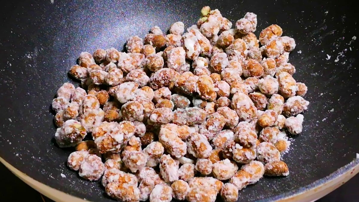 Thêm đậu khoai trời vào và khuấy liên tục. Lúc đầu, chúng sẽ dính vào nhau, nhưng đừng lo lắng, chỉ cần tiếp tục khuấy. Chẳng mấy chốc, từng củ khoai trời sẽ được phủ một lớp siro. Tiếp tục khuấy cho đến khi từng củ khoai trời tách ra và có màu trắng như cát. Sau đó, tắt bếp và nhấc nồi ra khỏi nồi. Khoai trời phủ sương đă sẵn sàng.