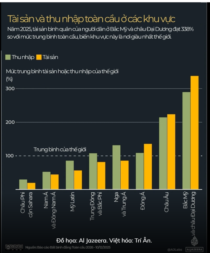 Năm 2025, tài sản bình quân của người dân ở Bắc Mỹ và châu Đại Dương đạt 338% so với mức trung bình toàn cầu, biến khu vực này là nơi giàu nhất thế giới. Tỷ lệ thu nhập đạt 290% so với mức trung bình toàn cầu cũng cao nhất thế giới.