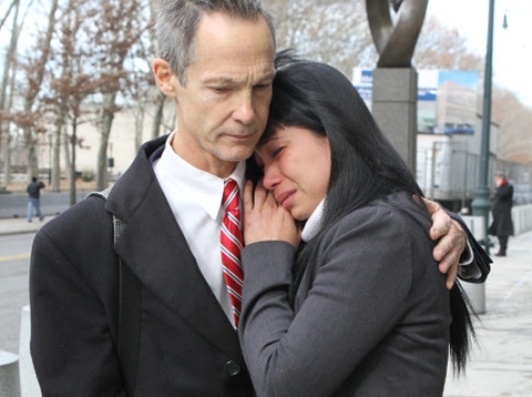 Lý Hương khóc bên ngoài Tòa án Gia đình tiểu bang New York hôm 16/12, bên cạnh luật sư Edward Kratt. Ảnh: New York Daily.