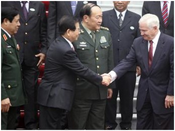 Chủ tịch Việt Nam Nguyễn Minh Triết (trái) bắt tay bộ trưởng Quốc phòng Mỹ Robert Gates.Đứng giữa là trưởng Quốc phòng Trung Quốc Lướng Quang Liệt (Ảnh: Reuters)
