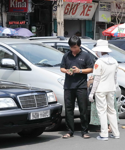 Ngày 18.3, chúng tôi đến đường Nguyễn Văn Chiêm (Q.1) thì chỉ còn một chỗ trống duy nhất trước cửa một quán cà phê ngay gần đoạn cắt với đường Hai Bà Trưng, do một chiếc xe hơi vừa dời đi trước đó. Ngay lập tức, bảo vệ quán này nhanh nhẹn bước ra hướng dẫn chúng tôi đậu xe vào khoảng trống còn lại. Thái độ nhiệt tình của anh này khiến chúng tôi "áy náy" vì thực ra điểm đến là quán bên cạnh. Nhưng khi chúng tôi đưa 15.000 đồng (vì cảm kích sự nhiệt tình lúc đầu nên đã có ý trả cao hơn lệ thường) tiền phí đậu xe thì anh này đòi tới 30.000 đồng. Chúng tôi thắc mắc, anh này giải thích: "Tôi mất 10.000 đồng cho đội thu phí rồi, số còn lại là công của tôi".