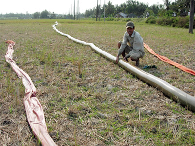 Nông dân huyện Châu Thành (Trà Vinh) kéo ống nước tìm nước ngọt bơm chuyền cứu lúa đông xuân - Ảnh: T.Trình