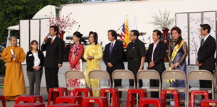Từ trái qua: Sư Minh Đăng, bà Denise Bishop, ông Takahiko Watabe, LS Thiên Trang, Bà Bich Ngoc, BS Vũ Ban, LM Phạm Hữu Tâm, LS Phạm Quang Huy và ông bà Kim Châu