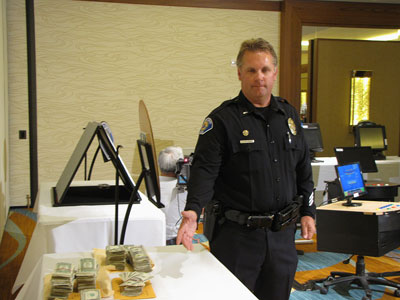 Trung Úy Jeff Nightengale của Sở Cảnh Sát Garden Grove chỉ tay vào số tiền mặt tịch thu trong chiến dịch bắt đánh bạc lậu tại các quán cà phê vùng Little Saigon. (Hình: Linh Nguyễn/Người Việt)
