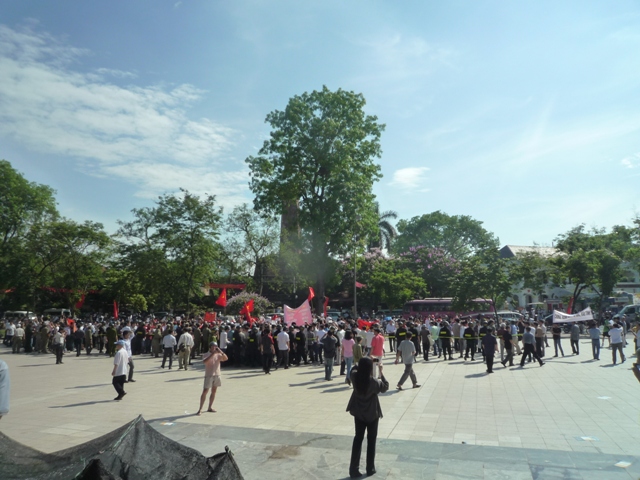 8h15′ – Vậy là đă rơ: Được phép biểu t́nh ôn ḥa! Thiệt là ơn đảng ơn chánh phủ, ơn các chú công an (không đông) … Chỉ ngăn 2 đầu ngă tư Hoàng diệu, Trần phú, Điện biên thôi. Vườn hoa Lenin, trước SQTQ đă có nhiều bà con đứng, trương biểu ngữ. Chú tài xế taxi hỏi “Cái ǵ đấy?”. BS: “Biểu t́nh chống TQ!”. Chú tài: “Ừ đúng rồi, phải thế chứ. Nó toàn tṛ ‘lấy thịt đè người’. Thế nào cũng oánh nhau!”