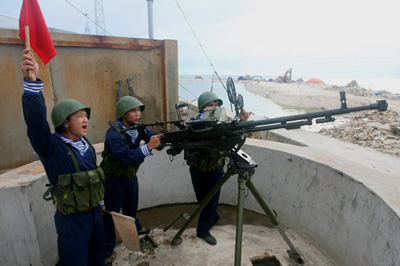 Lính Việt Nam tập dượt với súng 12.7mm tại đảo Phan Vinh, thuộc quần đảo Trường Sa của Việt Nam. Giới lănh đạo Việt Nam hiện đang ngả theo xu hướng đàm phán song phương với Trung Quốc về các vấn đề Biển Đông. (H́nh: Vietnam News Agency/AFP/Getty Images)