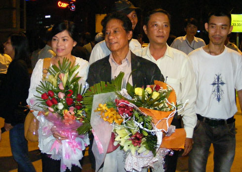 Vợ chồng Chế Linh về nước trong sự chào đón của người hâm mộ, tối 27/9, tại TP HCM. Ảnh: