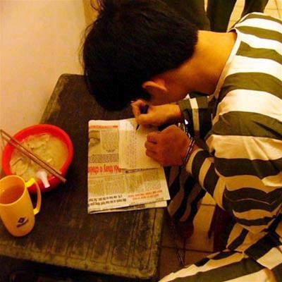 | Tử tù Vũ Xuân Trường làm thủ tục trước khi ra pháp trường. Ảnh: Nguyễn Như Phong. |