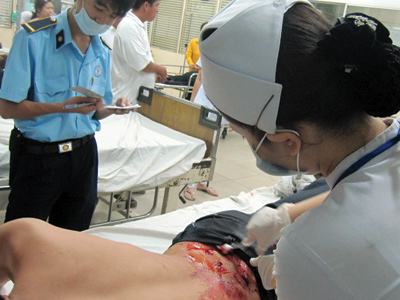 Còn L.N.T (25 tuổi, quê Khánh Hòa) thì vào cấp cứu trong tình trạng không mặc áo, máu vương khắp người. T. bị thương nặng do “dính” nhiều nhát chém ở lưng, bị đập vào đầu. Người nhà cho biết T. đi nhậu rồi mâu thuẫn với bạn nhậu và xảy ra đánh nhau tại một quán ở Q.12. Vì tức mình, T. lấy tay đập nát chai bia và hậu quả là thêm hai bàn tay bị thương, chảy máu bê bết.