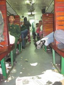Vì tàu ngày thường nên tại lượng khách trên toa số 2 cũng không kín ghế. Điều đầu tiên mà tôi bước lên toa số 2 là được các hành khách đã ngồi sẵn trên tàu nhắc: Mọi người lên nhanh rồi đóng hộ cửa vào bớt cái, hôi thối từ toilet (WC) ra khiếp quá. Và quả đúng như vậy, có lẽ nếu người nào say tàu xe mà khi bước lên toa tàu đã đụng phải mùi này rồi thì sẵn sàng nôn trước khi say do tàu lắc.