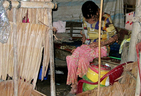 | | Chị Sa Ly với hàng ngh́n mụn thịt trên người. Ảnh: Thiên Phước. | Nhà nghèo, gia đ́nh chị Ly sống bằng nghề ṃ cua, bắt ốc, ai thuê ǵ làm đó. Mụn thịt mọc đầy các mi mắt nên hiện tại chị chỉ c̣n nh́n thấy lờ mờ, tay chân đau nhức không đi được mà chỉ nằm hoặc ngồi một chỗ.