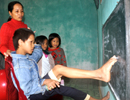 Trong ngôi nhà sâu hun hút giữa xóm ở thôn Phước Lộc, xã Đức Phú, huyện Mộ Đức, Sang đưa bàn chân phải kẹp viên phấn cong người cần mẫn tập viết trên chiếc bảng đen treo ở tường. Ngày nào cũng chứng kiến đứa con tật nguyền của mình ham học chữ như vậy, lòng người mẹ là chị Đỗ Thị Bé xót xa, nước mắt chảy dài.