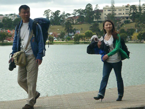 Không thuê được phòng khách sạn, du khách nước ngoài lang thang ở bờ hồ Xuân Hương. Ảnh: THẠCH THẢO