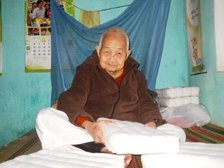 Mặc dù đă bước sang tuổi "xưa nay hiếm", mệ Trí Huệ vẫn cần mẫn làm những chiếc gối trong cung đ́nh