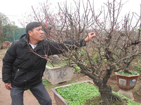 Theo lời giới thiệu của một người quen, chúng tôi t́m đến vườn đào của ông Lê Hàm, 49 tuổi, một người khá nổi tiếng ở làng đào Nhật Tân. Ông nổi tiếng không chỉ là một nghệ nhân "sáng tác" ra những dáng đào đẹp mà c̣n là người duy nhất nắm giữ được "bí kíp" ép đào Thất Thốn ra hoa đúng mùa. Lúc chúng tôi đến, ông Hàm cùng với vài lao động nữa đang đưa đào lên ô tô chuyển đến các tỉnh có nhu cầu thuê đào. Khi biết chúng tôi là phóng viên, ông Hàm vui vẻ xắn tay áo, mời chúng tôi vào nhà tiếp chuyện.