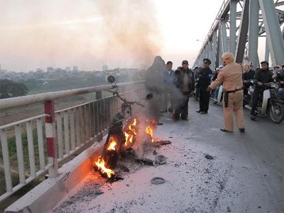 Một chiếc Attila bốc cháy khi đang lưu thông trên cầu Chương Dương vừa qua.