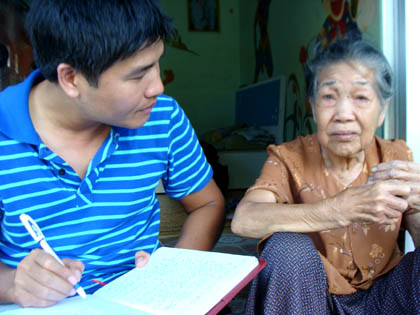 Tác giả trò chuyện với cụ bà Nguyễn Thị Hiền.