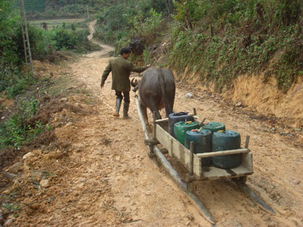 | Đường vào bản, xe trâu phải bỏ bánh để lao dốc. |