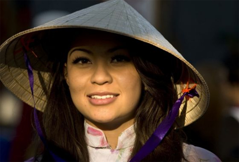 Thiếu nữ gốc Việt đội nón và mặc áo dài truyền thống trong lễ hội chào mừng Tết âm lịch tại Garden Grove, California, Mỹ. Ảnh: OC Register