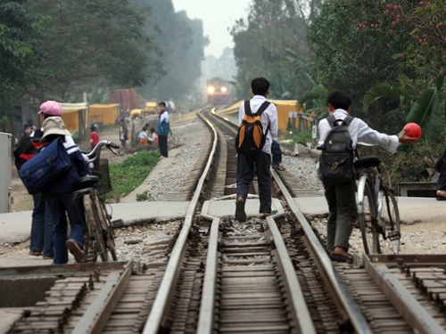 Trẻ em trên đường sắt đoạn qua xă Hữu Ḥa, Thanh Tŕ, Hà Nội khi một đoàn tàu sắp lao tới - Ảnh L.Q.P |