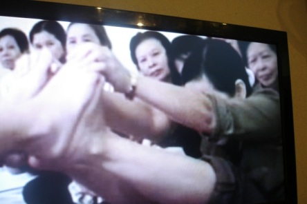 “Cô” vừa dứt lời, tức th́ khoảng hơn 30 bệnh nhân cả nam lẫn nữ được đội ngũ người giúp việc của “Phú - C̣” hô tập hợp thành hai hàng ngang. Sau đó, việc đầu tiên là các bệnh nhân chạy đều, khoảng 1 phút sau th́ đứng lại, rồi họ lại hô: “Bên trái... quay!”, người sau vỗ vào lưng người trước và ngược lại, cuối cùng là hít, thở nhẹ. Phần tiếp theo là hàng đằng sau ngồi xếp bằng, vẫn mặc nguyên quần áo; hàng đằng trước ngồi xuống nhưng phải cởi hết quần áo dài, chỉ c̣n quần lót và áo ngực. May thay trong pḥng được đặt 3 chiếc quạt nhiệt phả hơi nóng, nếu không th́ không biết điều ǵ sẽ xảy ra với các bệnh nhân trong tiết trời rét buốt này?