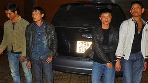 4 đối tượng ngồi trong chiếc xe trên được yêu cầu xuống xe, thỉnh thoảng đưa mắt “ngó nghiêng” vào trong xe.