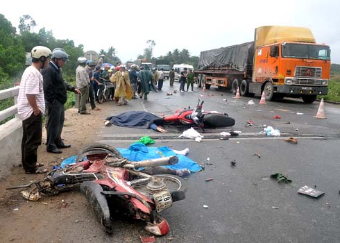 Xe tải tông hai xe máy, vợ chồng chết thảm