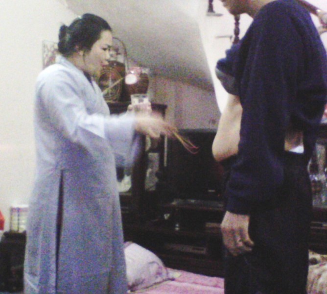 Cô làm vậy trong vài phút, sau đó bắt bệnh nhân của mình vén áo lên để cô tiếp tục chữa bằng hương. Thi thoảng cô quay về phía điện thờ, mắt nhìn lên ảnh Phật rồi gật đầu, trong miệng phát ra những tiếng “ục…ục” như thể đã nghe thấy chỉ đạo từ bề trên.