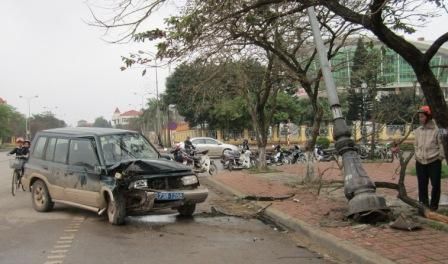 Xe biển xanh tông gãy cột đèn