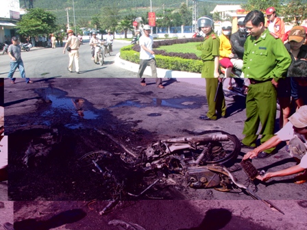 Container tông xe máy, cả 2 xe bốc cháy dữ dội