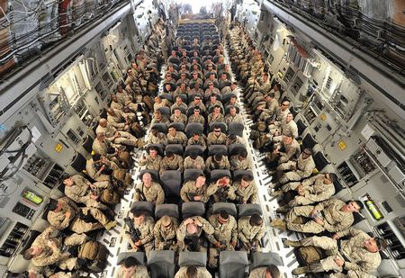 Cận cảnh lính Mỹ xếp hàng dài bên trong máy bay quân sự