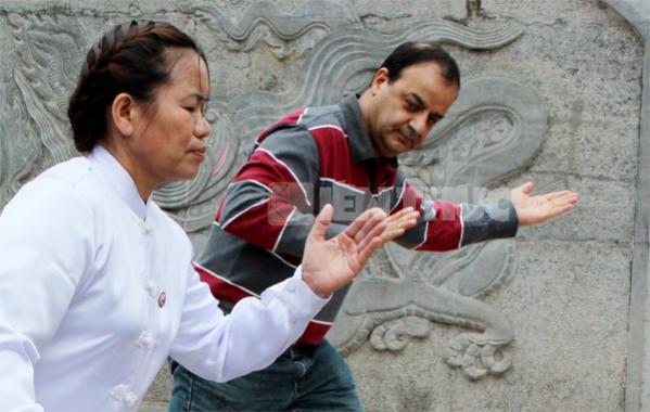 Người nước ngoài tập dưỡng sinh ở bờ Hồ Gươm