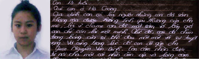 Con tên là Nguyễn Huyền Anh, con 13 tuổi, quê con ở Hà Giang. Gia đình con có 3 người nhưng con đã sớm không còn được hưởng tình yêu thương của cha me, bởi vì cha mẹ con đã mất sớm, và bây giờ con chỉ còn lại một mình. Lúc đó con đã chìm trong bóng tối của sự khổ đau mất mát và tuyệt vọng, cũng trong lúc đó con đã gặp Cha Giuse Nguyễn Văn Bình. Con cảm nhận được từ nơi Cha một cái nhìn ấm áp và lòng cảm thương sâu sắc dành cho con. Con thật hạnh phúc khi đón nhận tình thương đó và không biết tự lúc nào con đã gọi người đó là "Ba" Con là người hiểu Ba, con biết trong lòng Ba luôn thao thức xây dựng một ngôi nhà cho những đứa trẻ mồ côi, để chúng được sống cuộc sống của một gia đình, tràn đầy tình yêu thương và bình an.