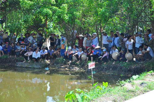 | Hàng trăm người dân tụ tập quanh ao nước nơi phát hiện xác Thùy |