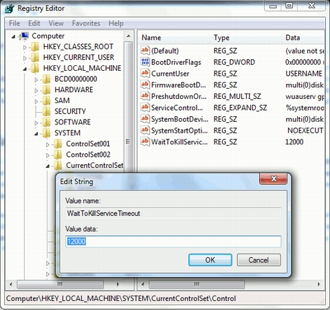 Windows 7 áp dụng thời gian đợi nhất định đối với các dịch vụ để tắt hoàn toàn mà không gây áp lực cho bộ xử lý máy tính. Nếu bạn có một bộ xử lý đủ nhanh thì không cần đến chức năng này. Nhưng tại sao phải đợi trong khi bạn có thể tắt máy ngay lập tức? Để tắt nhanh hệ điều hành Windows 7, người dùng có thể thực hiện bằng cách mở menu Start và gõ “regedit”. Trong cửa sổ Registry Editor bạn truy cập đến khoá: HKEY_LOCAL_MACHINE \ SYSTEM \ CurrentControlSet \ Control.