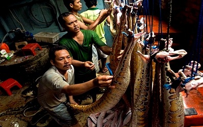 Trên đây là hình ảnh một lò mổ trăn ở Indonesia. Sàn nhà la liệt những tấm da trăn đã được lột. Những con trăn hoang dã sau khi được bắt về sẽ bị giết chết, bơm đầy nước và không khí vào trong người. Theo các thợ lột da chuyên nghiệp, việc làm này là để da trăn dễ lột hơn.
