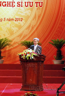Sự nghiệp cách mạng của dân tộc Việt Nam dưới sự lănh đạo của Đảng Cộng sản Việt Nam hơn 80 năm qua là nguồn cảm hứng bền bỉ và bất tận cho các thế hệ văn nghệ sỹ trưởng thành cùng cách mạng. Giải thưởng Nhà nước cao quư là sự ghi nhận của Đảng, Nhà nước và nhân dân đối với những đóng góp của anh chị em văn nghệ sỹ cho sự phát triển văn học nghệ thuật nước nhà… Tôi tin rằng các văn nghệ sỹ được nhận Giải thưởng Nhà nước cao quư hôm nay cũng chia sẻ với tôi ḷng biết ơn sâu sắc đối với các thế hệ lănh đạo Đảng Cộng sản Việt Nam, Nhà nước Cộng ḥa xă hội chủ nghĩa Việt Nam đă chăm lo, d́u dắt, tin cậy và quan trọng là đánh giá đúng những giá trị VHNT trong sự nghiệp cách mạng của dân tộc mà buổi Lễ long trọng này là một minh chứng. Cảm ơn nhân dân các dân tộc Việt Nam anh hùng – bầu sữa nuôi lớn những khát vọng sáng tạo nghệ thuật, cũng là người thẩm định vô tư nhất, chính xác nhất giá trị của các tác phẩm. Nghệ thuật chỉ có thể tồn tại khi nó tồn tại trong ḷng nhân dân, đồng hành cùng nhân dân…” (Do nhà văn Thái Bá Lợi đọc tại lễ trao Giải thưởng Nhà nước về VHNT) - Thứ hai ngày 28/5/2012