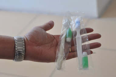Trong vai người đi tìm nguồn hàng kem và bàn chải đánh răng để phục vụ trong một nhà nghỉ sắp khai trương, chúng tôi hỏi mua loại kem đáng răng dùng trong khách sạn, không hẹn mà gặp, các chủ sạp đều đưa ra một bịch gồm khoảng một trăm tuýp kem đánh răng nhỏ, màu xanh. Tất cả chúng đều kèm theo bàn chải đánh răng, đúng loại chúng tôi cần tìm hiểu. Mỗi tuýp kèm bàn chải như vậy có giá từ 400 đến 600 đồng.