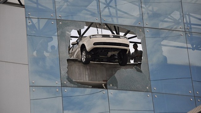 Đạp nhầm chân ga, xe lửng lơ giữa ṭa nhà