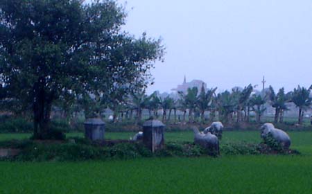 Người dân đă dẫn chúng tôi ra cánh đồng làng Đạo Khê (xă Trung Hưng). Theo truyền tụng, tại cánh đồng này từng có một khu lăng mộ của ông Quận rộng tới 10 mẫu. Mặc dù khu lăng mộ không c̣n nữa, song những vết tích c̣n lại cũng gợi lên sự tráng lệ một thời. Giữa cánh đồng, vẫn c̣n 4 con chó đá ngồi chồm hỗm giữa ruộng. Hai con ở rất xa, hai con ở gần trung tâm lăng mộ hơn và ngồi với tư thế quay mặt vào nhau.