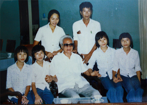 Cố Thủ tướng Phạm Văn Đồng chụp hình lưu niệm cùng 4 cô gái Bắc, Nam, Thống, Nhất và vợ chồng bà Hương tại phủ Thủ tướng. Ảnh do gia đình cung cấp.