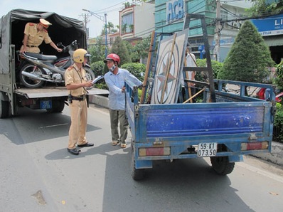 gần 30 trường hợp xe ba gác, xe máy không biển số, không gương chiếu hậu, không đèn xi-nhan, chở hàng hóa cồng kềnh bị giữ lại v́ vi phạm lỗi quá khổ, quá tải, tự ư thay đổi kết cấu gây nguy hiểm cho người đi đường...Trong đó, nhiều trường hợp tỏ ra bất hợp tác với lực lượng CSGT khi không chịu xuất tŕnh giấy tờ, để xe lại rồi bỏ đi hoặc rồ ga bỏ chạy...