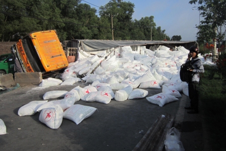 Lật xe tải, hàng trăm bao bột mỳ chặn quốc lộ
