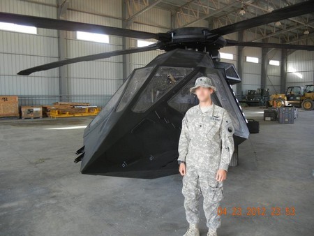 Hình ảnh một lính Mỹ đứng cạnh trực thăng có thiết kế góc cạnh tương tự như máy bay tàng hình F-117A Night Hawk đang khiến các chuyên gia quân sự thắc mắc.